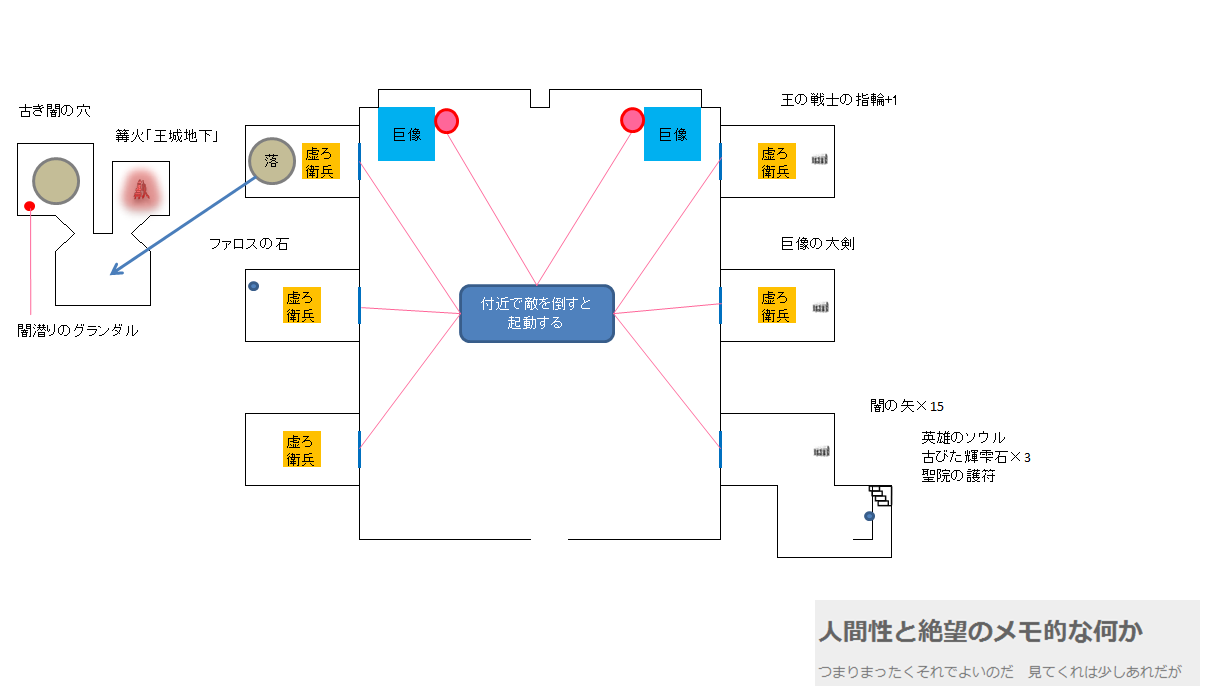 左奥の部屋は落とし穴になっていて、落ちると篝火「王城・地下」とNPC「闇潜りのグランダル」がいる。ここで3回目の会話の場合この時点で「古き闇の穴」にいける。