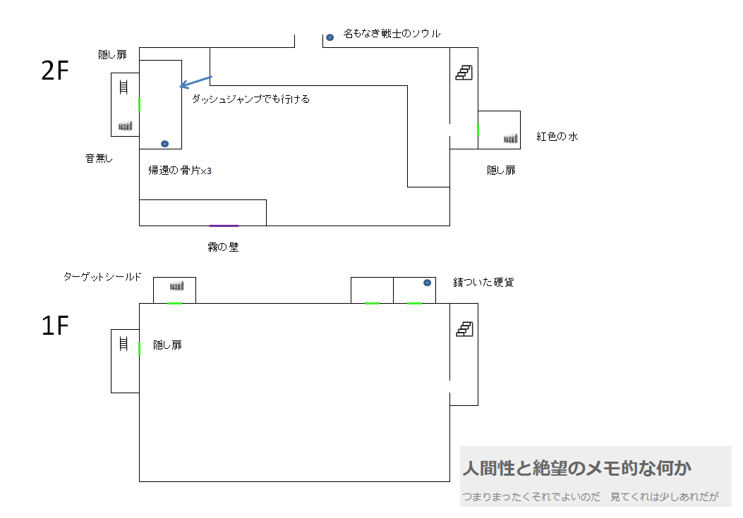 ・ボス(虚ろの衛兵)エリア1階 時計に見立て、入口を7時とすると10時、11時、1時、1時半計4か所 10時の隠し扉は2階の隠し扉へ続いている